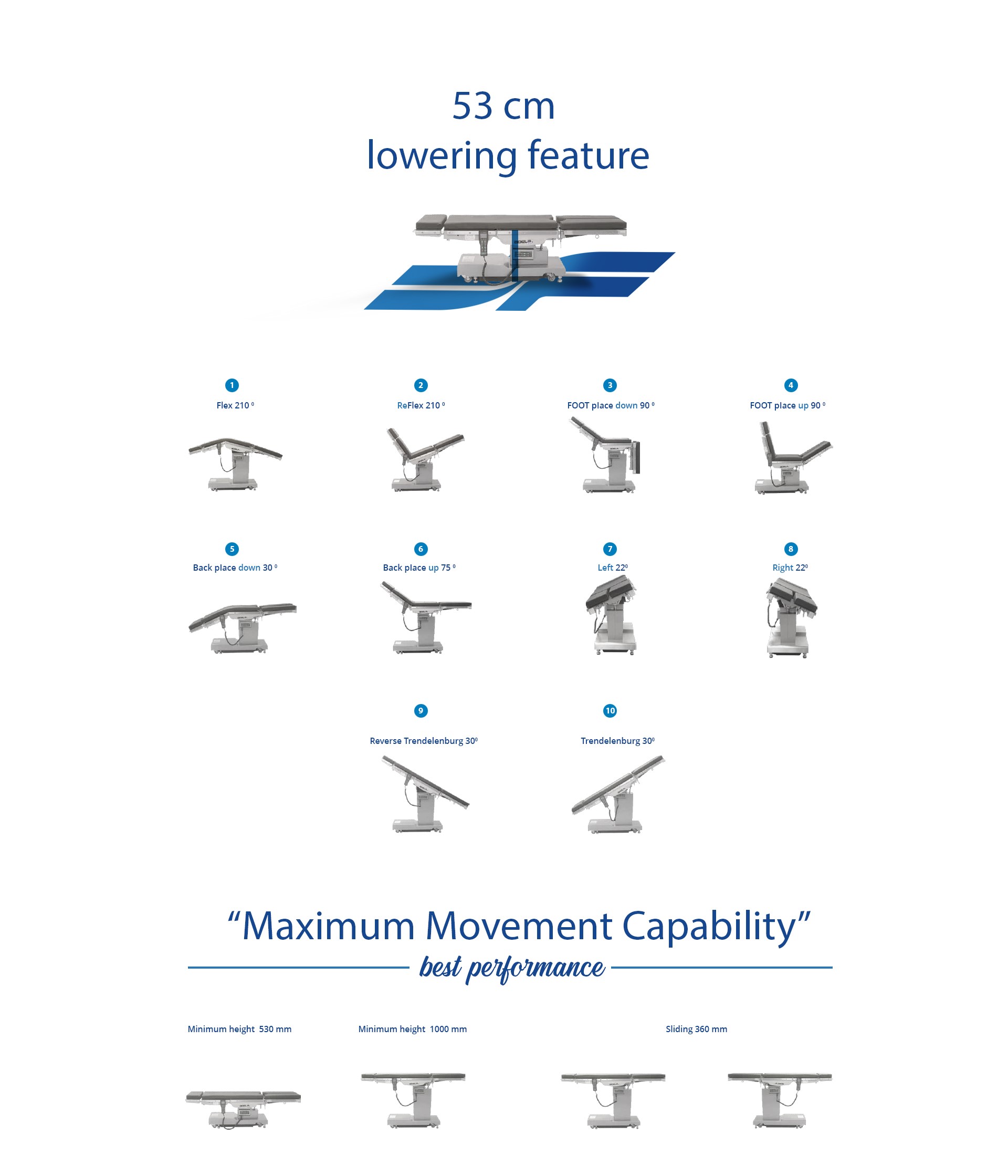 Possibility of ensuring the silent and no-vibration up and down, back piece, Trendelenburg and reverse Trendelenburg, right and left, lateral and horizontal back and forth (sliding) movements of the table using the hand control