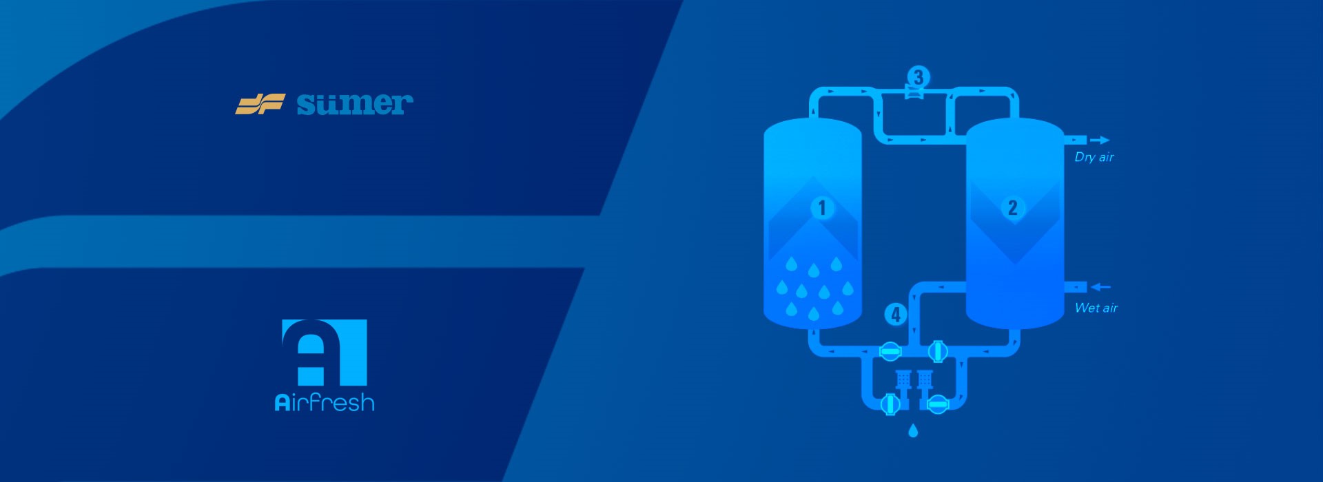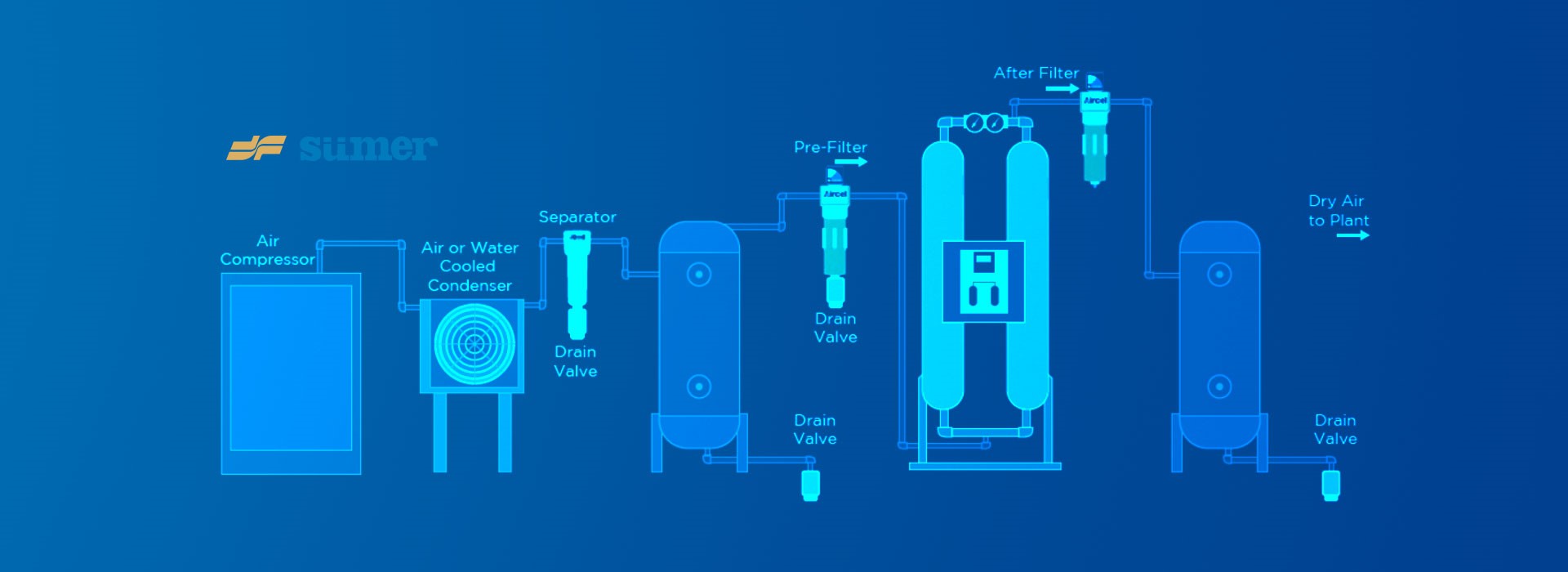 Sümer's desiccant dryers produce dry compressed air from 0 oC to -72 oC Celsius pressure dew point in a reliable and energy efficient way while protecting your systems and processes. First, air is compressed up to 7-13 bars with the help of compressors. Filtration takes place thereafter to filter out the condensed water, remaining particles, aerosol and oil which is in the pressurized air stream. Finally, air is supplied into the PSA tanks to remove the moisture in the air.